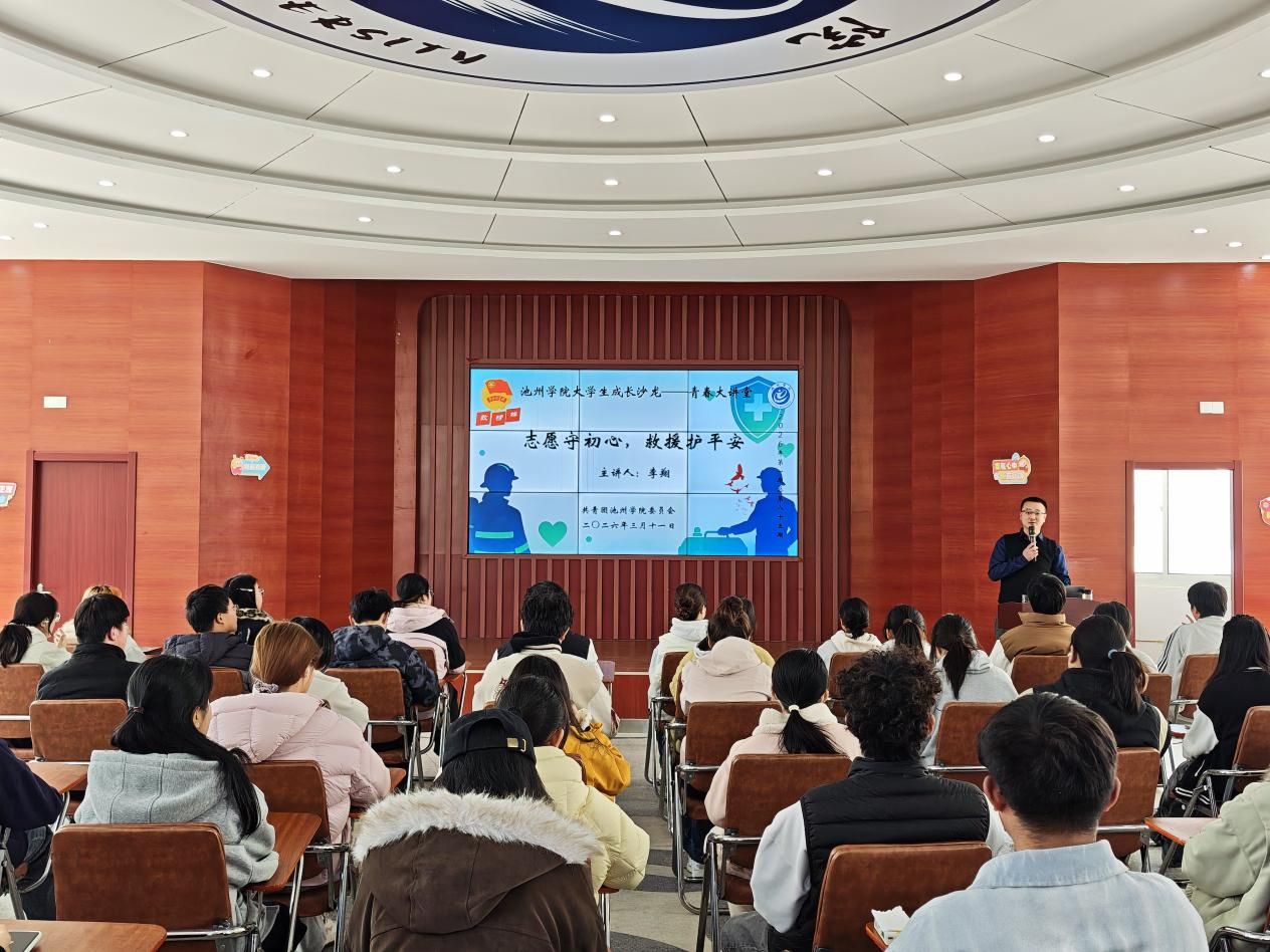 3月11日,池州学院大学生成长沙龙 “青春大讲堂” 2026年第一期(总第八十五期)在大学生活动中心一楼顺利举办。本期青春大讲堂以“志愿守初心 救援护平安”为主题,特邀池州市蓝天救援队队长、池州市贵池区红十字应急救护培训中心主任李翔担任主讲嘉宾,为我校青年学子带来一堂融知识传授、技能实操与精神洗礼于一体的生命教育课。